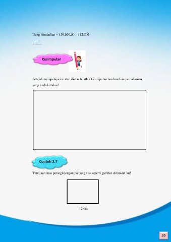 Uang kembalian = 150.000,00 – 112.500 = ....... Kesimpulan Setelah mempelajari materi diatas buatlah kesimpulan berdasarkan pemahaman yang anda ketahui! Contoh 2.7 Tentukan luas persegi dengan panjang sisi seperti gambar di bawah ini! 12 cm 35