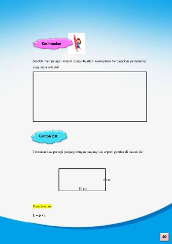 Kesimpulan Setelah mempelajari materi diatas buatlah kesimpulan berdasarkan pemahaman yang anda ketahui! Contoh 2.8 Tentukan luas persegi panjang dengan panjang sisi seperti gambar di bawah ini! 6 cm 10 cm Penyelesaian: L = p × l 40