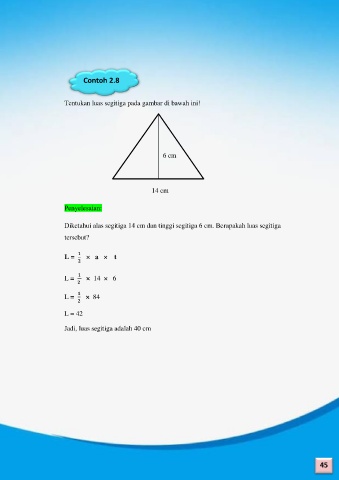 Diketahui alas segitiga 14 cm dan tinggi segitiga 6 cm. Berapakah luas segitiga