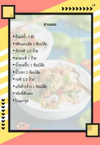19 ส่วนผสม •กุ้งแม่น ้า 5 ตัว •พริกแกงเผ็ด 2 ช้อนโต๊ะ •หัวกะทิ 1/2 ถ้วย •หางกะทิ 1 ถ้วย •น ้าตาลปี๊บ 1 ช้อนโต๊ะ •น ้าปลา 2 ช้อนโต๊ะ •กะทิ 1/2 ถ้วย •แป้งข้าวจ้าว 1 ช้อนโต๊ะ •พริกชี้ฟ้าแดง •ใบมะกรูด