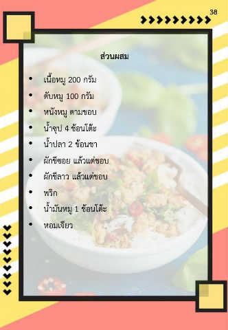38 ส่วนผสม • เนื้อหมู 200 กรัม • ตับหมู 100 กรัม • หนังหมู ตามชอบ • น ้าซุป 4 ช้อนโต๊ะ • น ้าปลา 2 ช้อนชา • ผักชีซอย แล้วแต่ชอบ • ผักชีลาว แล้วแต่ชอบ • พริก • น ้ามันหมู 1 ช้อนโต๊ะ • หอมเจียว