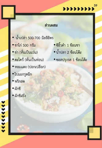59 ส่วนผสม • น ้าเปล่า 500-700 มิลลิลิตร •ขาไก่ 500 กรัม •ซีอิ๊วด า 1 ช้อนชา •ข่า (หั่นเป็นแว่น) •น ้าปลา 2 ช้อนโต๊ะ •ตะไคร้ (หั่นเป็นท่อน) •ซอสปรุงรส 1 ช้อนโต๊ะ •หอมแดง (ปอกเปลือก) •ใบมะกรูดฉีก •พริกสด •ผักชี •ผักชีฝรั่ง