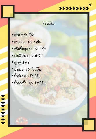 78 ส่วนผสม •กะปิ 2 ช้อนโต๊ะ •กระเทียม 1/2 ก ามือ •พริกขี้หนูสวน 1/2 ก ามือ •มะเชือพวง 1/2 ก ามือ •กุ้งสด 3 ตัว •น ้ามะนาว 3 ช้อนโต๊ะ •น ้าส้มคั้น 3 ช้อนโต๊ะ •น ้าตาลปี๊ป 1/2 ช้อนโต๊ะ