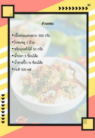 80 ส่วนผสม •เนื้อหอยแครงลวก 300 กรัม •ใบชะพลู 1 ถ้วย •พริกแกงคั่วใต้ 50 กรัม •น ้าปลา 3 ช้อนโต๊ะ •น ้าตาลปี๊บ ½ ช้อนโต๊ะ •กะทิ 500 ml