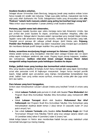 Saya berpesan kepada Saudara agar selalu menjaga nama baik Almamater Unisba. Apa