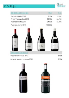D.O. Rioja BODEGAS PUJANZA 70cl 1.5L Pujanza Hado 2012 8.20€ 15.99€ Finca Valdepoleo 2011 12.90€ 26.90€ Pujanza Norte 2011 34.90€ 65.00€ Pujanza cisma 2011 104.00€ Bodegas Medrano Medrano Crianza 2012 5.95€ Mas de Medrano Autor 2011 9.90€