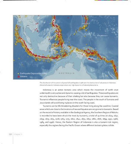 The distribution of the centers of powerfull earthquakes (>5M) and the distribution of volcanoes in Indonesia.