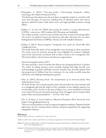 • Harrington, L. (2016.)  Traversing gender: Understanding transgender realities.