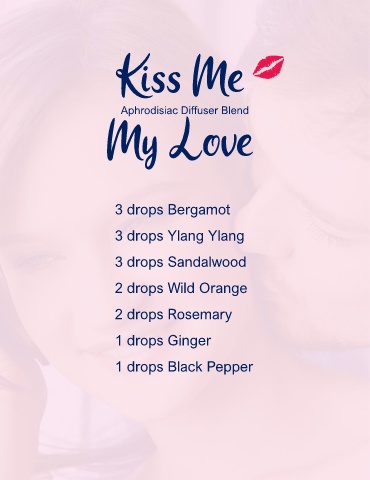 Kiss Me Aphrodisiac Diffuser Blend My Love 3 drops Bergamot 3 drops Ylang Ylang 3 drops Sandalwood 2 drops Wild Orange 2 drops Rosemary 1 drops Ginger 1 drops Black Pepper