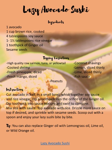 Cut avocado in half. In a small bowl, whisk together soy sauce