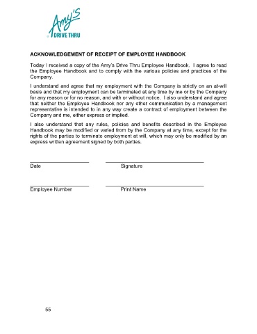 Today I received a copy of the Amy’s Drive Thru Employee Handbook. I agree to read
