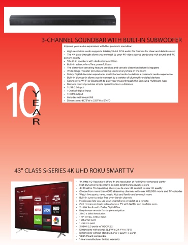3-CHANNEL SOUNDBAR WITH BUILT-IN SUBWOOFER YEAR 10 YEAR 43" CLASS S-SERIES 4K UHD ROKU SMART TV