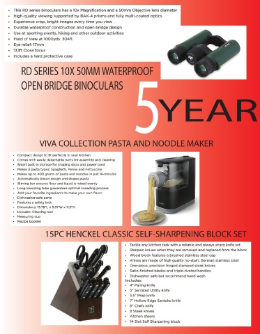 5 RD SERIES 10X 50MM WATERPROOF OPEN BRIDGE BINOCULARS YEAR VIVA COLLECTION PASTA AND NOODLE MAKER 15PC HENCKEL CLASSIC SELF-SHARPENING BLOCK SET