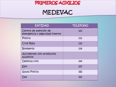 MEDEVAC ENTIDAD TELEFONO Centro de atención de 123 emergencia y seguridad interno Policia 112 Cruz Roja 132 Bomberos 119 Accidentes con productos químicos Defensa civil 144 Sijin 157 Gaula Policia 166 Das 153
