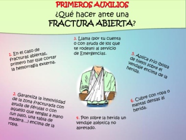 ¿Qué hacer ante una FRACTURA ABIERTA? 3. Llama (por tu cuenta o con ayuda de los que te rodean) al servicio de Emergencias. 4. Pon sobre la herida un vendaje aséptica no apretado.