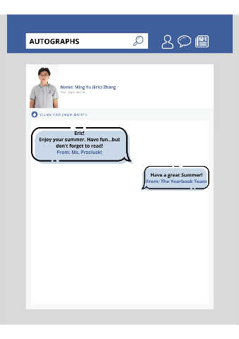 AUTOGRAPHS Name: Ming Yu (Eric) Zhang Yearbook owner You and 3,835 people liked this. Eric! Enjoy your summer. Have fun...but don't forget to read! From: Ms. Przeluski Have a great Summer! From: The Yearbook Team