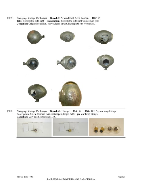 [303] Category: Vintage Car Lamps Brand: G.E Lamps ID #: 74 Title: G.E Pre war lamp fittings