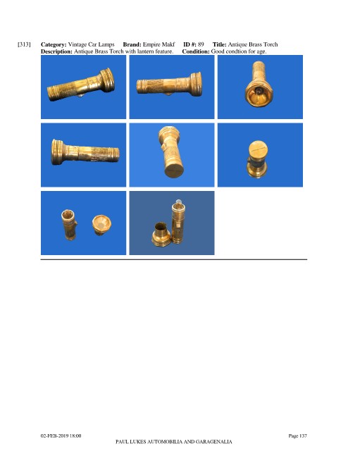[313] Category: Vintage Car Lamps Brand: Empire Makf ID #: 89 Title: Antique Brass Torch Description: Antique Brass Torch with lantern feature. Condition: Good condtion for age. 02-FEB-2019 18:00 Page 137 PAUL LUKES AUTOMOBILIA AND GARAGENALIA