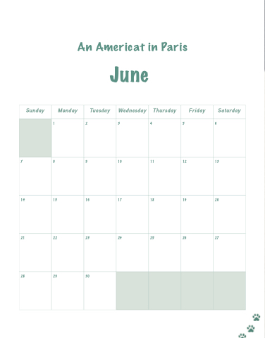 An Americat in Paris June Sunday Monday Tuesday Wednesday Thursday Friday Saturday 1 2 3 4 5 6 7 8 9 10 11 12 13 14 15 16 17 18 19 20 21 22 23 24 25 26 27 28 29 30