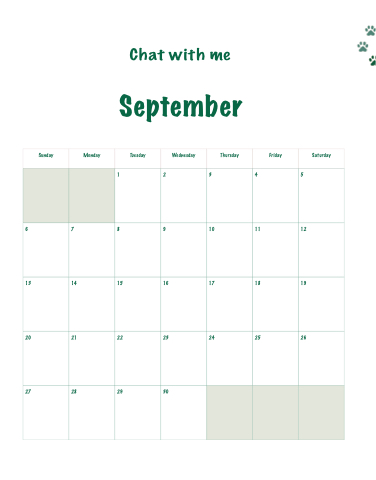 Chat with me September Sunday Monday Tuesday Wednesday Thursday Friday Saturday 1 2 3 4 5 6 7 8 9 10 11 12 13 14 15 16 17 18 19 20 21 22 23 24 25 26 27 28 29 30