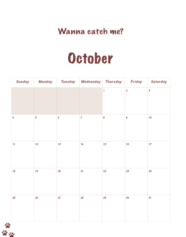 Wanna catch me? October Sunday Monday Tuesday Wednesday Thursday Friday Saturday 1 2 3 4 5 6 7 8 9 10 11 12 13 14 15 16 17 18 19 20 21 22 23 24 25 26 27 28 29 30 31
