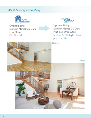 4504 Shorepointe Way Original Listing Days on Market: 25 Days Low Offers Did Not Sell Updated Listing Days on Market: 30 Days Multiple Higher Offers Sold for $130k higher than previous offers Before After 9
