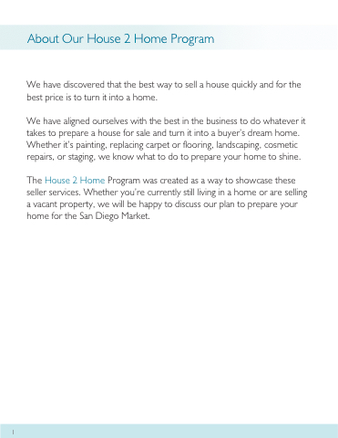 The House 2 Home Program was created as a way to showcase these seller services. Whether you’re currently still living in a home or are selling a vacant property, we will be happy to discuss our plan to prepare your home for the San Diego Market.