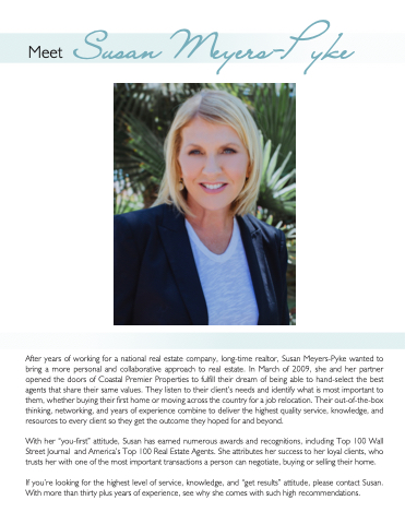 After years of working for a national real estate company, long-time realtor, Susan Meyers-Pyke wanted to bring a more personal and collaborative approach to real estate. In March of 2009, she and her partner opened the doors of Coastal Premier Properties to fulfill their dream of being able to hand-select the best them, whether buying their first home or moving across the country for a job relocation. Their out-of-the-box thinking, networking, and years of experience combine to deliver the highest quality service, knowledge, and resources to every client so they get the outcome they hoped for and beyond.
