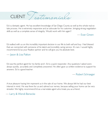 Ed is a fantastic agent. He has excellent knowledge of San Diego County as well as the whole real es- tate process. He is extremely responsive and an advocate for his customer, bringing strong negotiation skills as well as a complete sense of integrity. Would work with him again!!