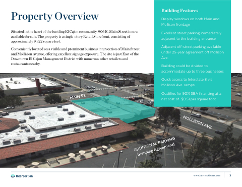 Conveniently located on a visible and prominent business intersection of Main Street and Mollision Avenue, offering excellent signage exposure. The site is just East of the Downtown El Cajon Management District with numerous other retailers and restaurants nearby.
