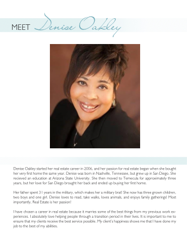 Denise Oakley started her real estate career in 2006, and her passion for real estate began when she bought her very first home the same year. Denise was born in Nashville, Tennessee, but grew up in San Diego. She recieved an education at Arizona State University. She then moved to Temecula for approximately three years, but her love for San Diego brought her back and ended up buying her first home.
