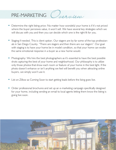 Staging if needed. This is client option. Our stagers are by far some of the top profession- als in an iego ounty. “here are stagers and then there are our stagers”. ur goal with staging is to have your home be in model condition, so that your home can evoke the same emotional response in a buyer as a new home would.