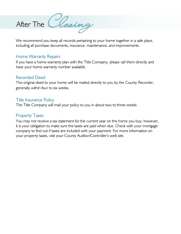 We recommend you keep all records pertaining to your home together in a safe place, including all purchase documents, insurance, maintenance, and improvements.