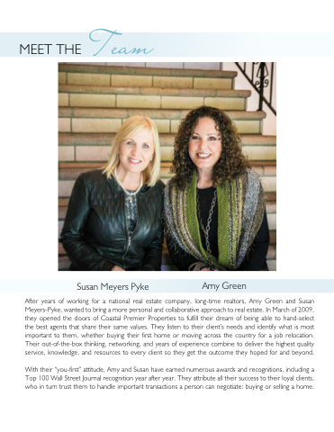 After years of working for a national real estate company, long-time realtors, Amy Green and Susan Meyers-Pyke, wanted to bring a more personal and collaborative approach to real estate. In March of 2009, they opened the doors of Coastal Premier Properties to fulfill their dream of being able to hand-select the best agents that share their same values. They listen to their client’s needs and identify what is most important to them, whether buying their first home or moving across the country for a job relocation. Their out-of-the-box thinking, networking, and years of experience combine to deliver the highest quality service, knowledge, and resources to every client so they get the outcome they hoped for and beyond.