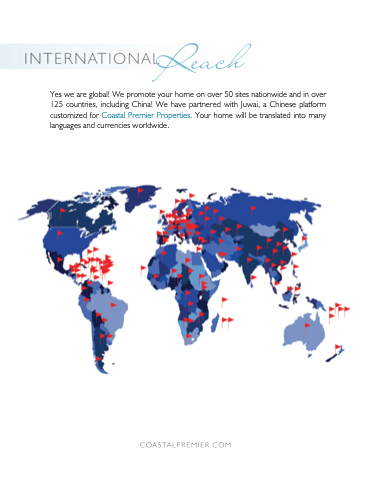 Yes we are global! We promote your home on over 50 sites nationwide and in over 125 countries, including China! We have partnered with Juwai, a Chinese platform customized for Coastal Premier Properties. Your home will be translated into many languages and currencies worldwide.