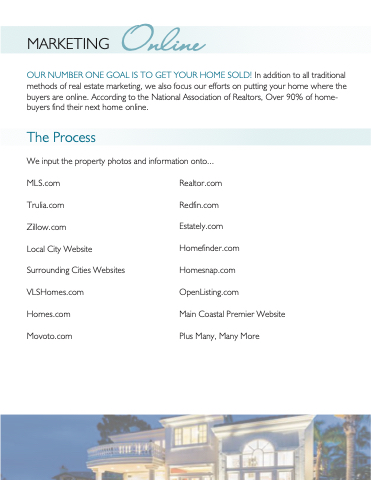 OUR NUMBER ONE GOAL IS TO GET YOUR HOME SOLD! In addition to all traditional methods of real estate marketing, we also focus our efforts on putting your home where the buyers are online. According to the National Association of Realtors, Over 90% of home- buyers find their next home online.