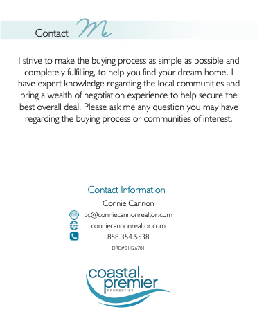 Connie Cannon cc@conniecannonrealtor.com conniecannonrealtor.com 858.354.5538 DRE#01126781