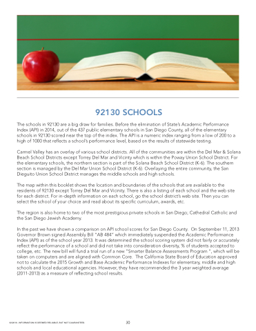 The map within this booklet shows the location and boundaries of the schools that are available to the residents of 92130 except Torrey Del Mar and Vicinity. There is also a listing of each school and the web site for each district. For in-depth information on each school, go the school district’s web site. Then you can select the school of your choice and read about its specific curriculum, awards, etc.