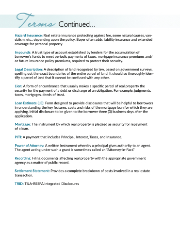 Hazard Insurance: Real estate insurance protecting against fire, some natural causes, van- dalism, etc., depending upon the policy. Buyer often adds liability insurance and extended coverage for personal property.