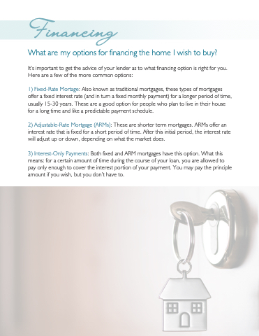 It’s important to get the advice of your lender as to what financing option is right for you. Here are a few of the more common options: