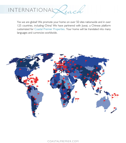 Yes we are global! We promote your home on over 50 sites nationwide and in over 125 countries, including China! We have partnered with Juwai, a Chinese platform customized for Coastal Premier Properties. Your home will be translated into many languages and currencies worldwide.