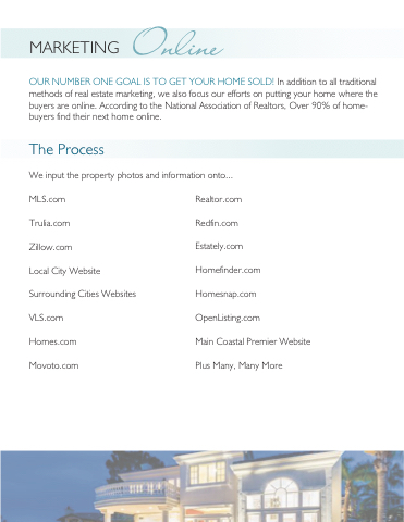 OUR NUMBER ONE GOAL IS TO GET YOUR HOME SOLD! In addition to all traditional methods of real estate marketing, we also focus our efforts on putting your home where the buyers are online. According to the National Association of Realtors, Over 90% of home- buyers find their next home online.