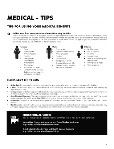 MEDICAL - TIPS TIPS FOR USING YOUR MEDICAL BENEFITS Utilize your free preventive care benefits to stay healthy. • • • • • • • • • • • • • • • • • • • • • • • • • GLOSSARY OF TERMS • • • • • • EDUCATIONAL VIDEO 13