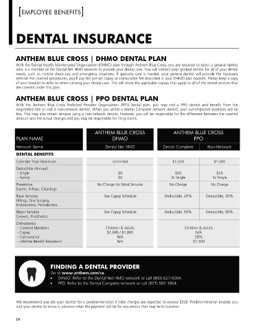 [EMPLOYEE BENEFITS] DENTAL INSURANCE ANTHEM BLUE CROSS | DHMO DENTAL PLAN ANTHEM BLUE CROSS | PPO DENTAL PLAN ANTHEM BLUE CROSS ANTHEM BLUE CROSS PLAN NAME DHMO PPO DENTAL BENEFITS FINDING A DENTAL PROVIDER • • 14
