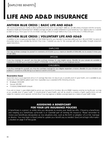 [EMPLOYEE BENEFITS] LIFE AND AD&D INSURANCE ANTHEM BLUE CROSS | BASIC LIFE AND AD&D ANTHEM BLUE CROSS | VOLUNTARY LIFE AND AD&D EMPLOYEE SPOUSE CHILD(REN) Guarantee Issue • • • ASSIGNING A BENEFICIARY FOR YOUR LIFE INSURANCE POLICIES 16