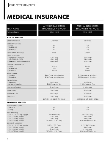 [EMPLOYEE BENEFITS] MEDICAL INSURANCE ANTHEM BLUE CROSS ANTHEM BLUE CROSS PLAN NAME HMO SELECT NETWORK HMO VIVITY NETWORK HEALTH BENEFITS PHARMACY BENEFITS 6