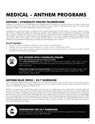 MEDICAL - ANTHEM PROGRAMS ANTHEM | LIVEHEALTH ONLINE TELEMEDICINE Benefit Highlights • • • GET STARTED WITH LIVEHEALTH ONLINE ANTHEM BLUE CROSS | 24/7 NURSELINE CONTACTING THE 24/7 NURSELINE 9