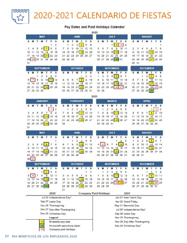 2020-2021 CALENDARIO DE FIESTAS 24 RIA BENEFICIOS DE LOS EMPLEADOS 2020