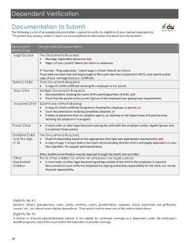 The following is a list of acceptable documentation required to verify the eligibility of your claimed dependent(s).