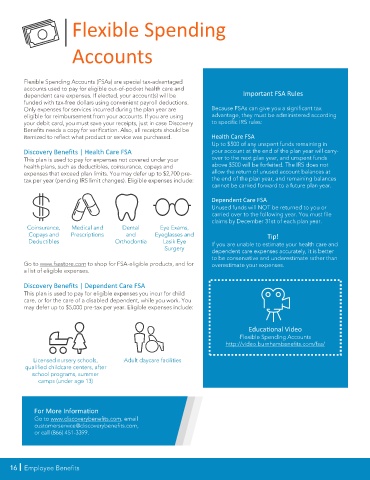 Flexible Spending Accounts Important FSA Rules Health Care FSA Discovery Benefits | Health Care FSA Dependent Care FSA Tip! Discovery Benefits | Dependent Care FSA Educational Video For More Information